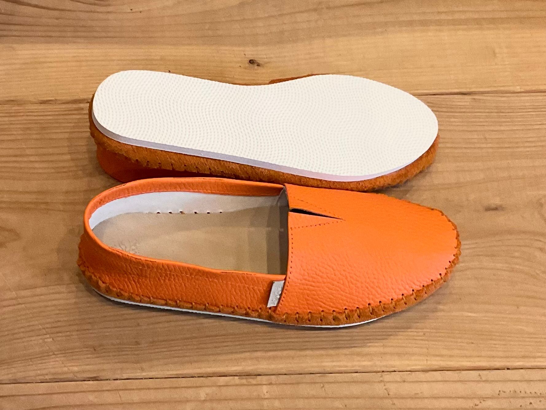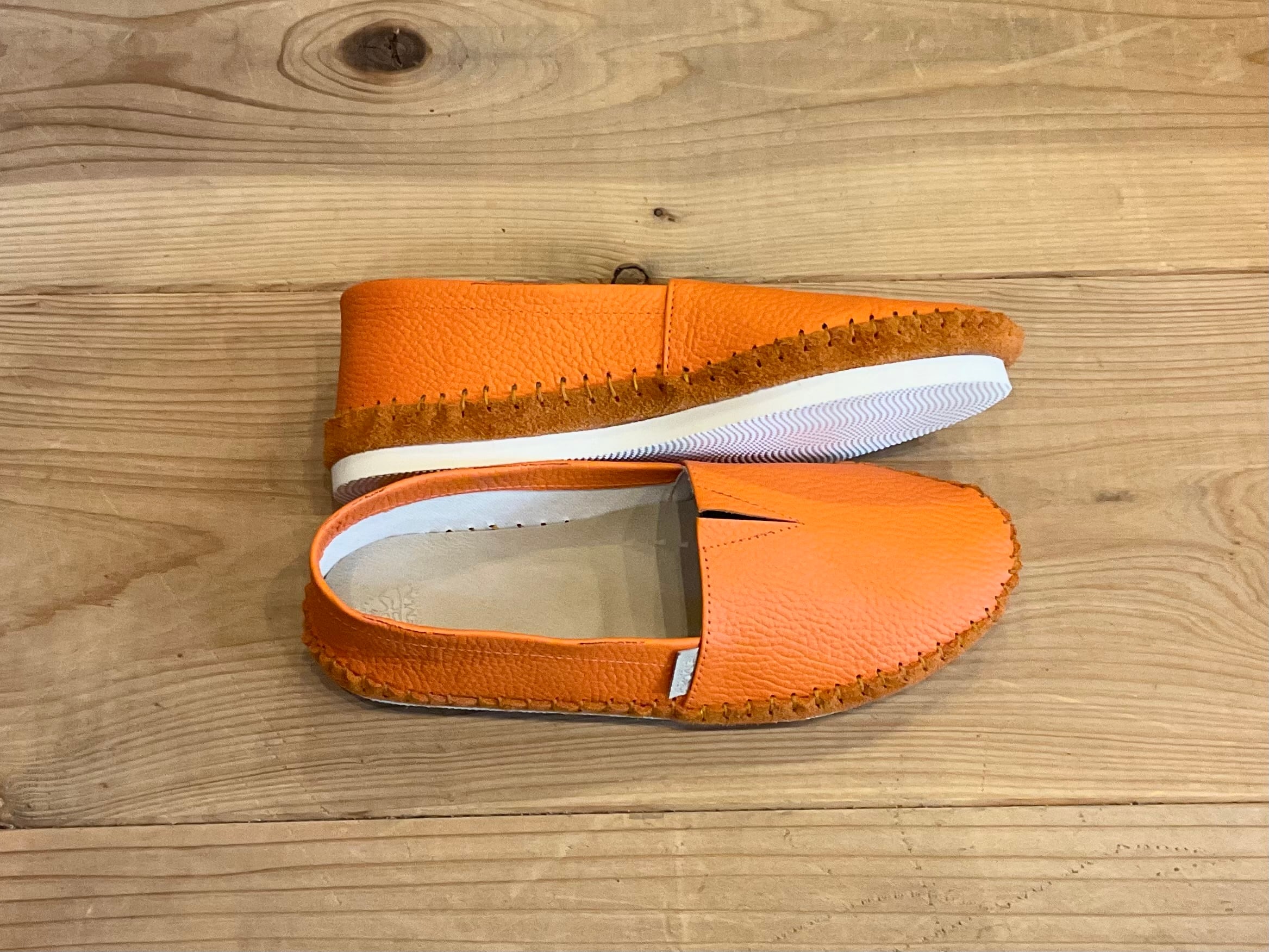 ビタミンカラーのオレンジが目を引く、軽やかなレザースリッポン。