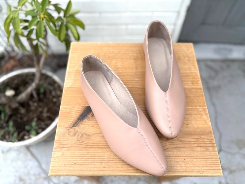 上品ピンクベージュのレザーフラットシューズ|柔らかレザーで大人の足元に