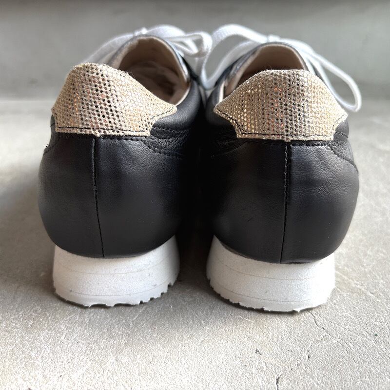 シックなブラックレザーにホワイトソールを合わせ、秋冬コーデに馴染みながらもワンポイントで遊び心をプラスしました。